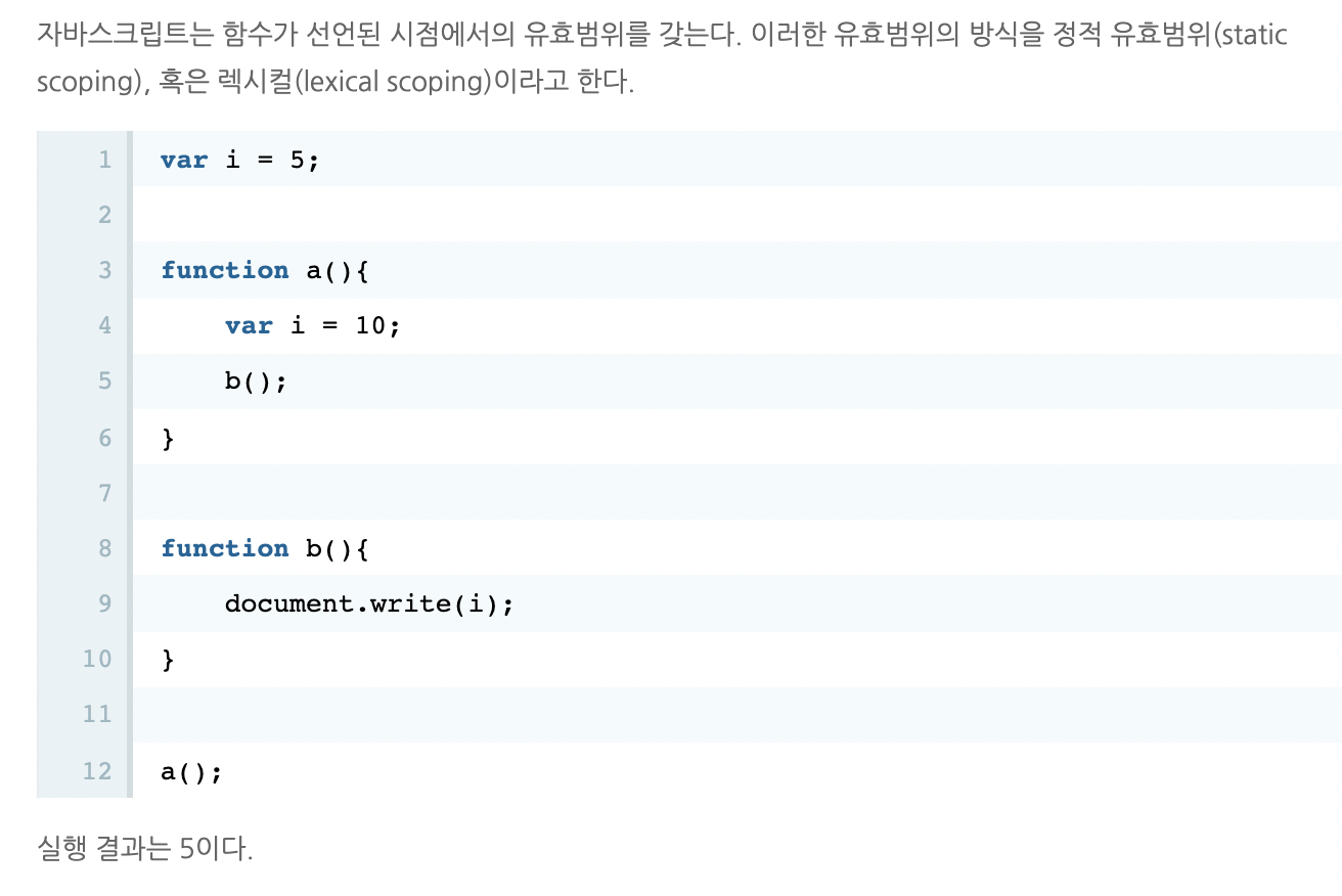 함수 b가 정의되었을 때, 지역변수 i는 없고, 전역변수 i의 값은 5이므로 실행결과가 5가 된다.