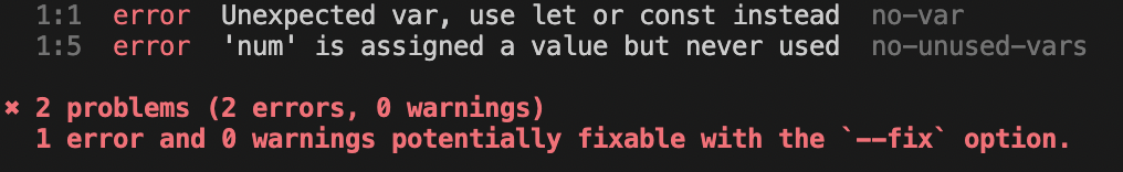 ---> 이 경우, var 와 세미콜론을 안쓴것이 lint에 걸려야 한다.